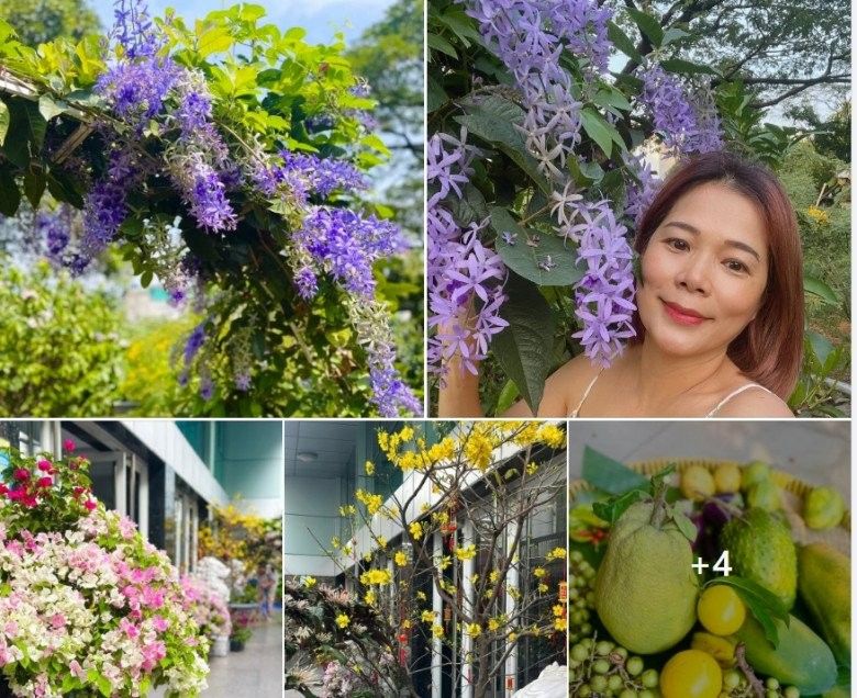 Không phải ở resort nào xa hoa mà Mỹ Lệ đang ở trong chính khu vườn của mình với những dàn hoa rất đẹp. Những chùm hoa mai xanh nở rộ khiến mọi người mê mẩn.