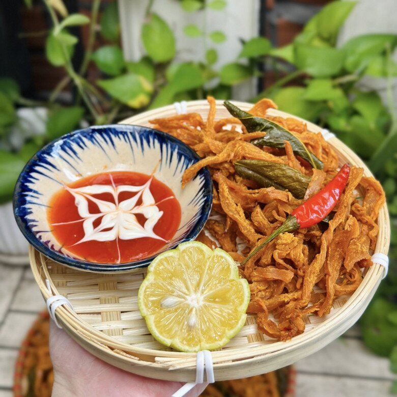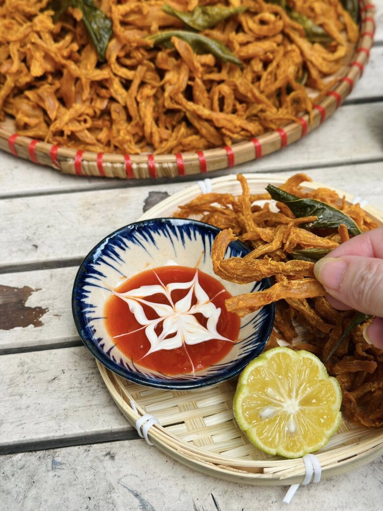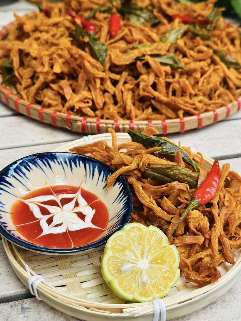 Khô gà lá chanh từ lâu đã trở thành món ăn vặt quen thuộc trong ngày Tết, vừa tiện để đãi khách, vừa dễ bảo quản, càng ăn càng thấy “bắt miệng”. Từng sợi gà xé mềm dai, thấm vị mặn ngọt hài hòa, quyện cùng hương lá chanh thơm nhẹ và chút cay cay nơi đầu lưỡi, khiến ai nếm thử cũng khó dừng. Không cầu kỳ như những món cỗ truyền thống, khô gà lá chanh mang đến cảm giác mới mẻ, hiện đại nhưng vẫn rất hợp không khí sum vầy đầu năm.