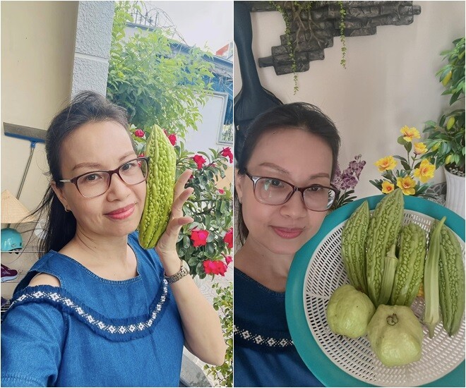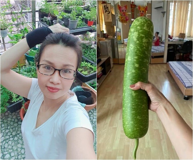 "Sáng nay em lại thăm vườn, em đây hái được 4 nàng dưa leo". Sự tươi xanh của nông sản sạch tại gia giúp nữ ca sĩ thư giãn sau những giờ làm việc căng thẳng.