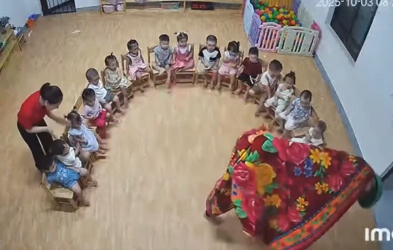 Cụ thể, video được cắt từ camera giám sát tại một lớp học mẫu giáo. Trong clip đó là không gian lớp học có 16 em học sinh trong độ từ 2-3 tuổi đang ngồi trên ghế, được xếp thành hình chữ u.
