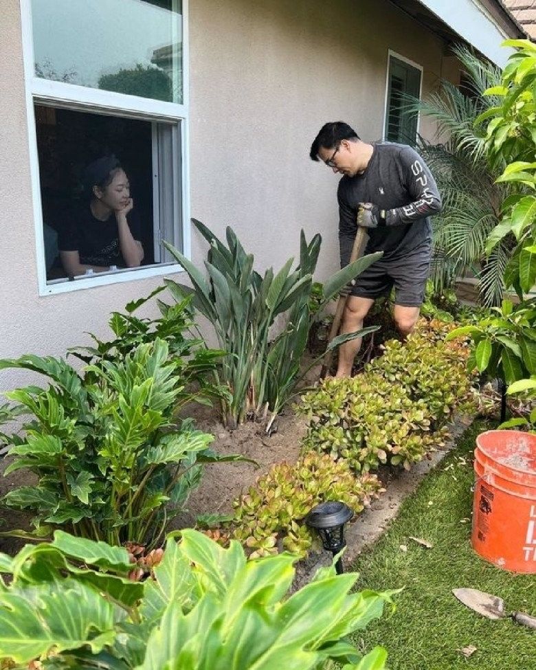 Sau khi kết hôn, "Vua cá Koi" Thắng Ngô dành nhiều thời gian ở Mỹ cùng vợ trong căn "biệt phủ". Thỉnh thoảng, cả 2 chia sẻ khoảnh khắc tận hưởng cuộc sống bình yên, gần gũi với thiên nhiên tại đây. Cũng là người yêu thích cây cảnh, Thắng Ngô nhanh chóng đảm nhận vai trò "người làm vườn", chăm chỉ cuốc đất, bón phân cho cây trái. Thậm chí, vì quá thích khu vườn của vợ nên nam doanh nhân đã lên ý định sang Mỹ định cư.
