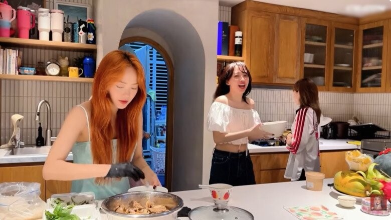 Minh Hằng trực tiếp vào bếp chuẩn bị bữa ăn đãi hội bạn thân gồm Tóc Tiên, Misthy, và Đồng Ánh Quỳnh... trong không gian bếp ấm cúng.