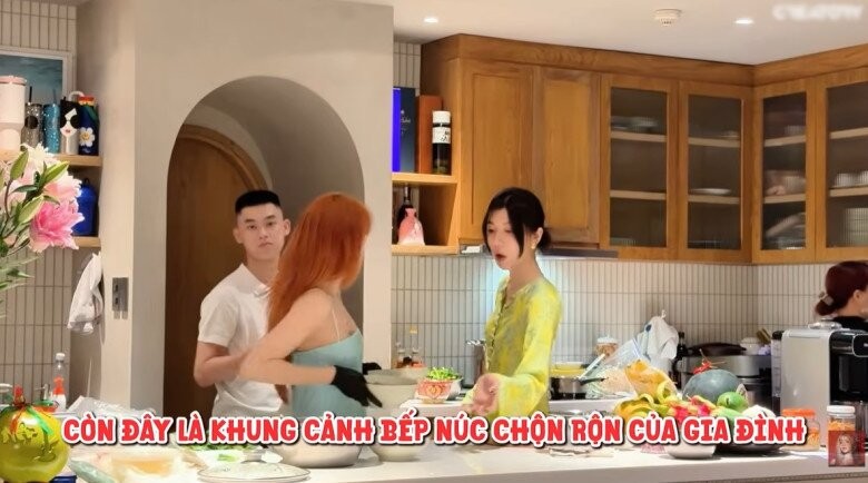 Khung cảnh bếp núc rộn ràng khi các nghệ sĩ cùng nhau chuẩn bị bữa tối. Không gian mở tạo nên sự tiện nghi tối đa cho những buổi tụ họp đông người.