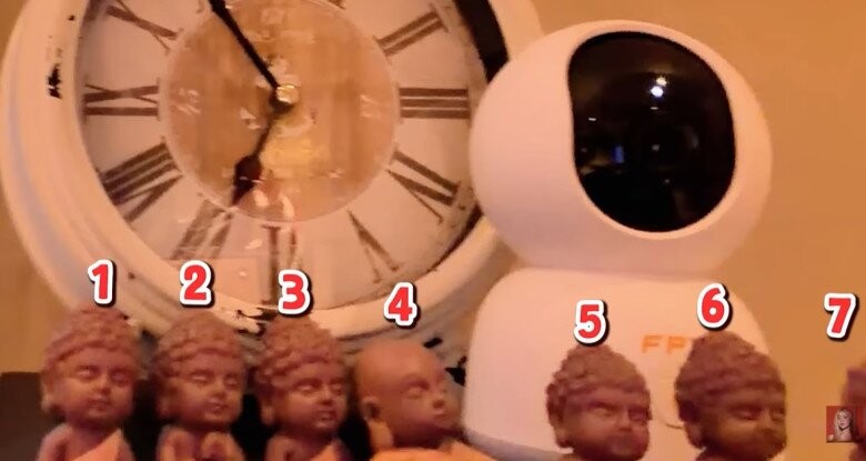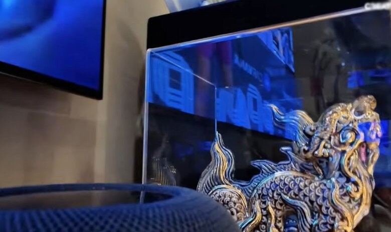 Một góc tâm linh yên tĩnh với bức tượng linh vật được đặt trang trọng trong lồng kính và những bức tượng nhỏ đặt gần tivi.
