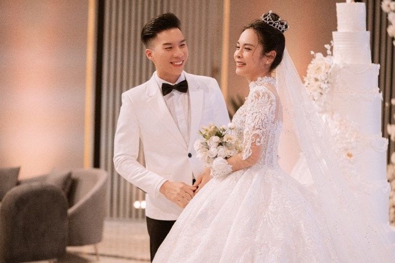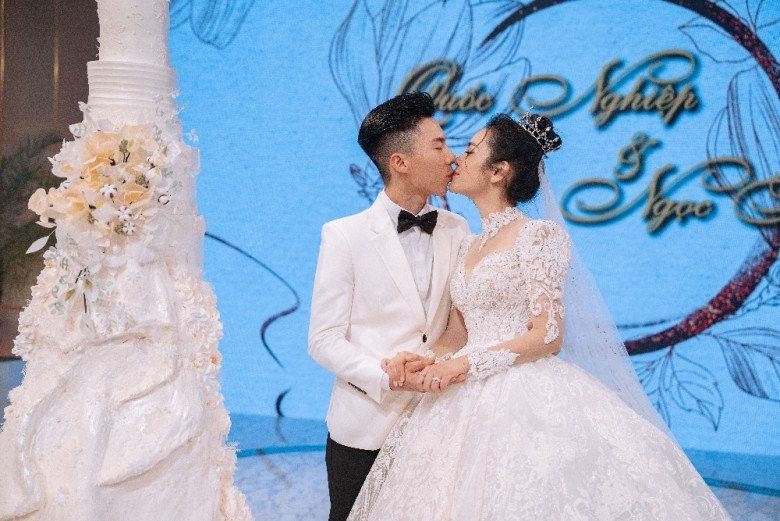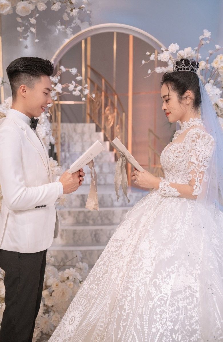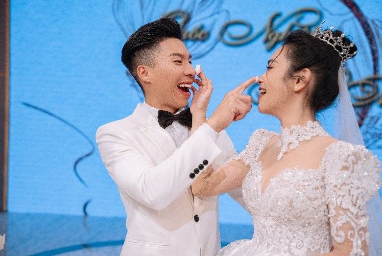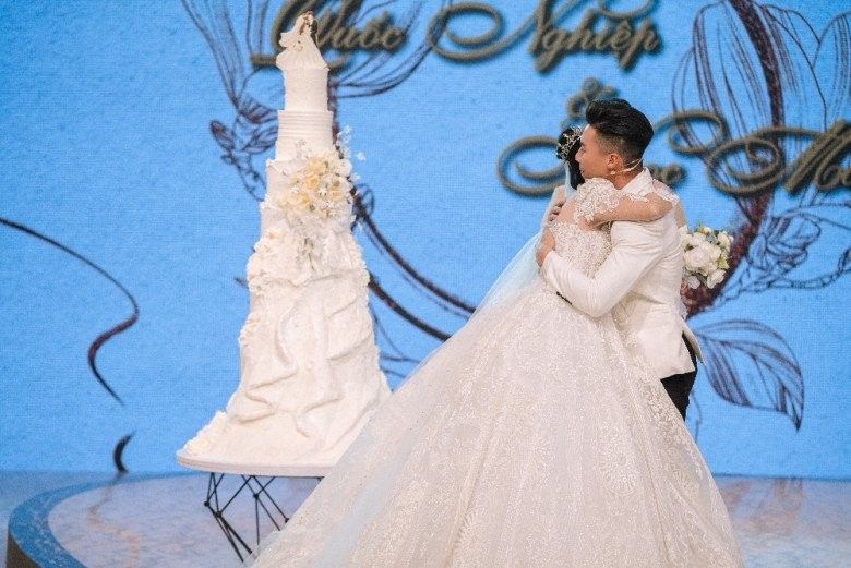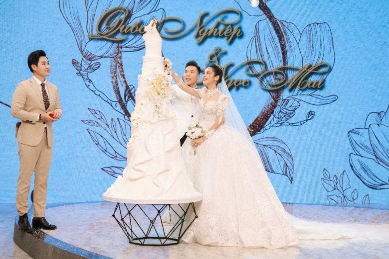 Không chỉ cô dâu chú rể khoác lên mình trang phục cưới mà sân khấu cũng được chuẩn bị đầy đủ hoa cưới, bánh cưới... cả hai cùng đọc những lời thề nguyện dành cho nhau.