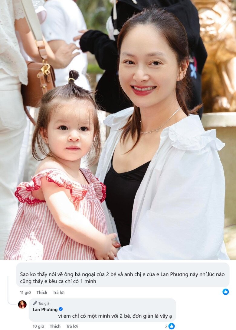 Đáng chú ý, một tài khoản bày tỏ sự thắc mắc: "Sao không thấy nói về ông bà ngoại của 2 bé và anh chị em của Lan Phương nhỉ. Lúc nào cũng thấy em kêu ca chỉ có 1 mình". Phản hồi lại bình luận trên, Lan Phương cho biết: "Vì em chỉ có một mình với 2 bé, đơn giản là vậy ạ".