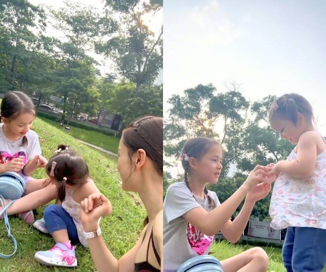 Lan Phương chia sẻ: "Có những ngày mẹ để cô giúp việc nghỉ, chỉ có 3 mẹ con bên nhau. 3 mẹ con đi chơi, tự chăm sóc nhau, Lina cũng đột nhiên chủ động chăm em chu đáo, em Mia thì vô cùng hạnh phúc khi có chị bên cạnh. Một mình với 2 con, đủ thứ phải xoay xở rồi đến cuối ngày nằm ôm con cảm thấy mọi thứ đều xứng đáng".