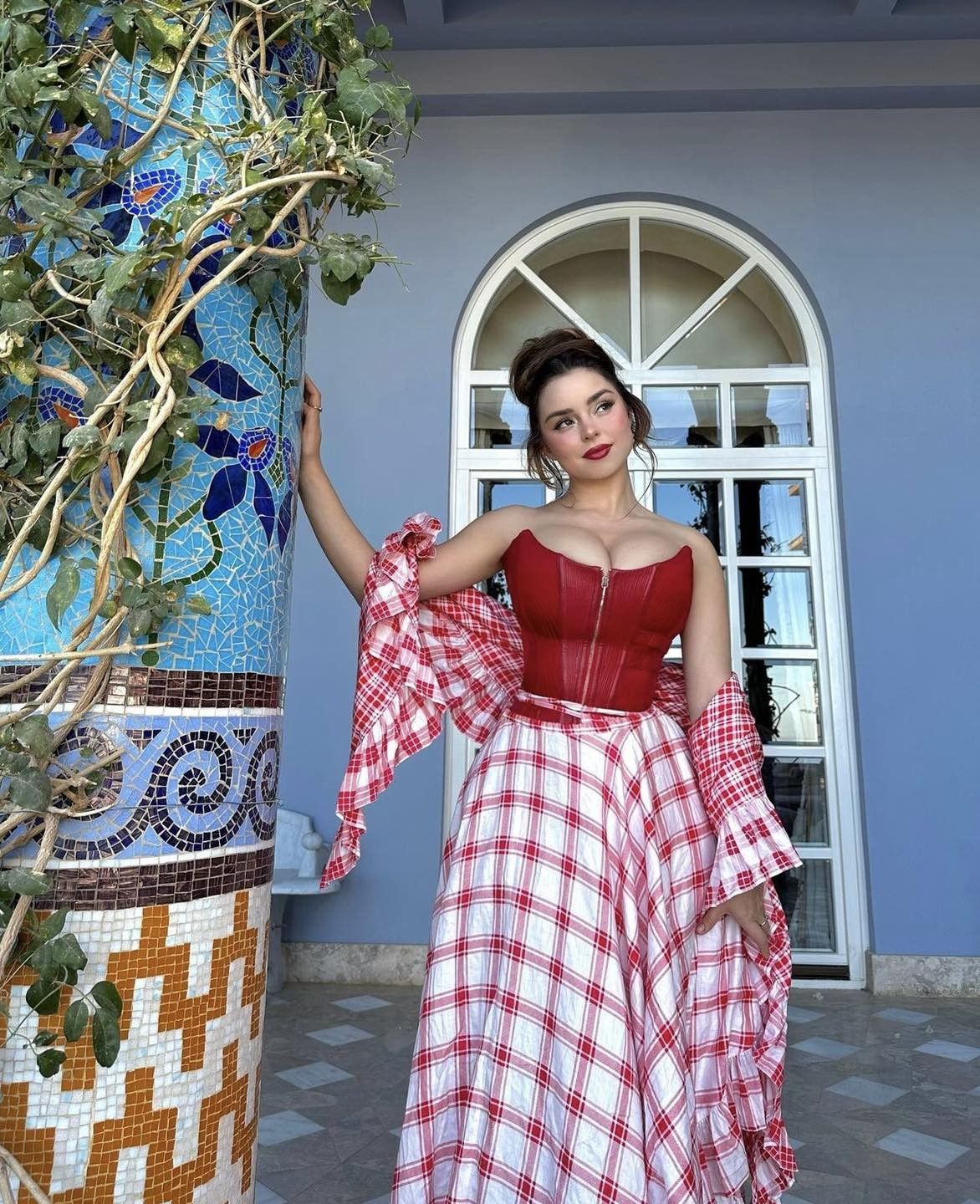 Không chỉ tái hiện phong cách đặc trưng của các Nữ hoàng với tông màu vàng gold, cô nàng còn xúng xính váy áo với các bộ cánh quý tộc năm xưa là váy áo cúp ngực có phần eo được định hình với corset.