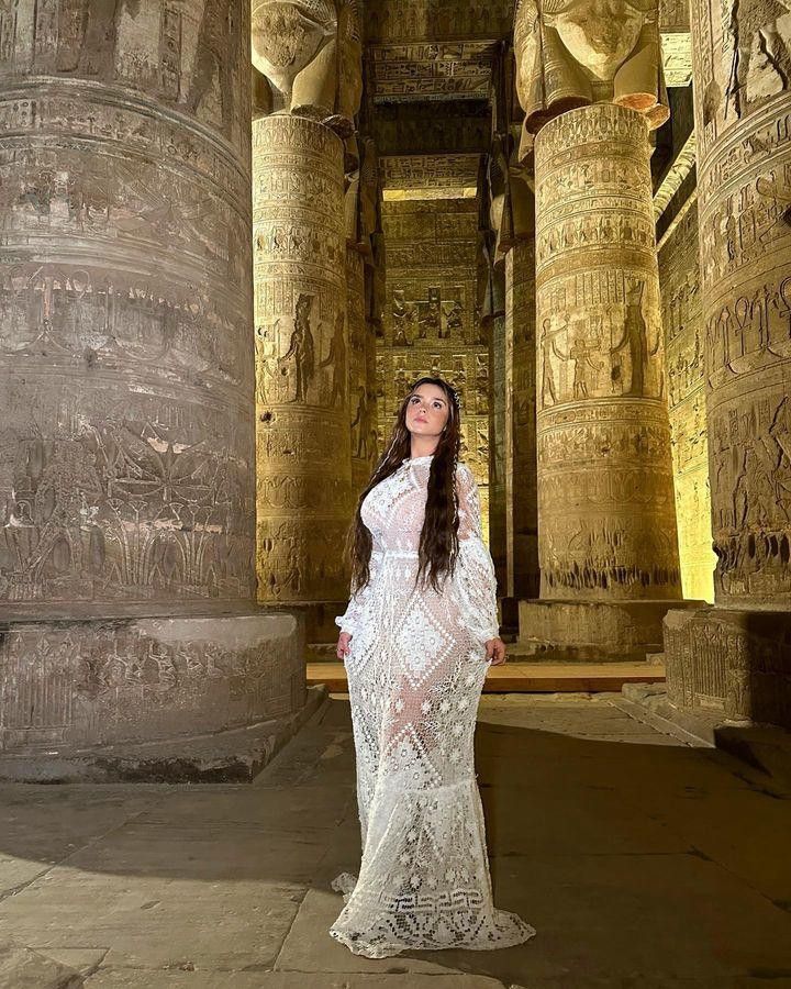 Demi Rose rất chịu chi khi ăn mặc ăn ý với phong cảnh tại Ai Cập. Thiết kế đầm xuyên thấu màu xanh pastel tuyệt đẹp còn có họa tiết, hoa văn độc đáo.