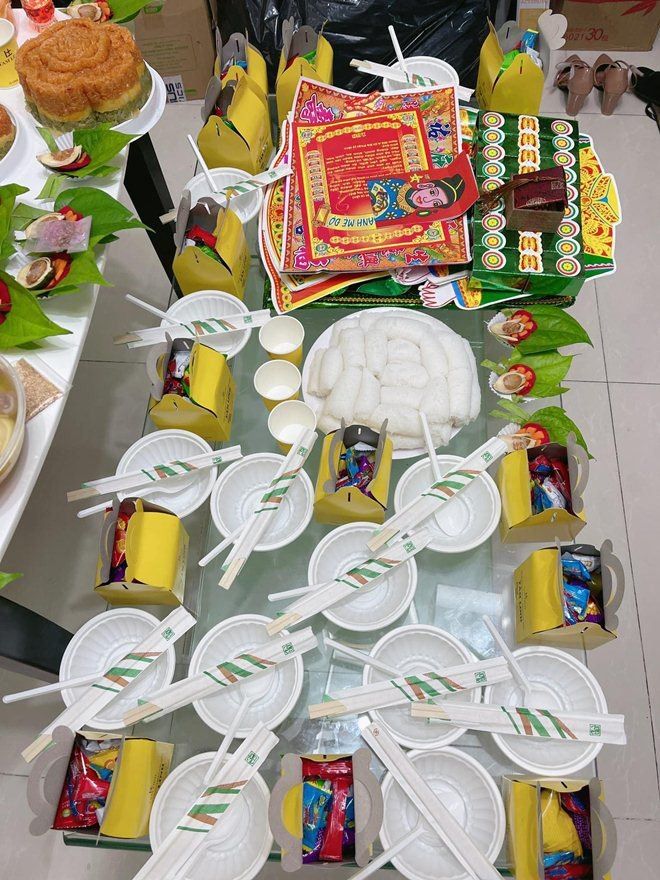 Cặp bố mẹ đã chuẩn bị mâm lễ trang trọng với đầy đủ các lễ vật từ xôi, chè, thạch, bánh, trầu, cau, hương, hoa... cho đến gà luộc, bánh kẹo kèm bóng trang trí. Tất cả đồ vật được lấy màu vàng làm màu chủ đạo.