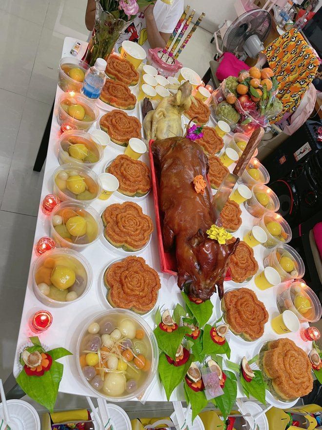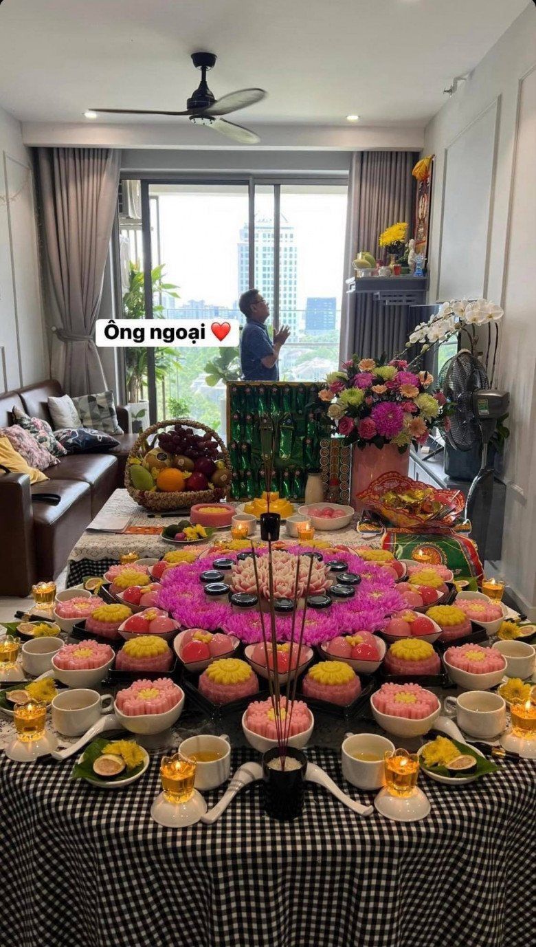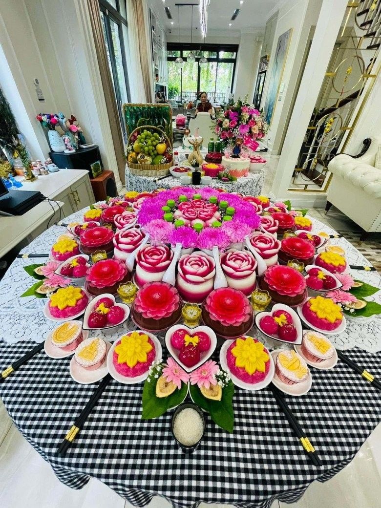 Mâm cúng thịnh soạn này có đầy đủ xôi, chè, hoa tươi, trái cây, bánh kem,... Đáng nói hơn, những món ăn này đều được cắt tỉa, trang trí thành hình bông hoa trông rất bắt mắt. Dân tình còn dí dỏm cho rằng chỉ cần nhìn vào mâm cúng dành cho con đã biết vợ chồng Vân Hugo khá giả ra sao.
