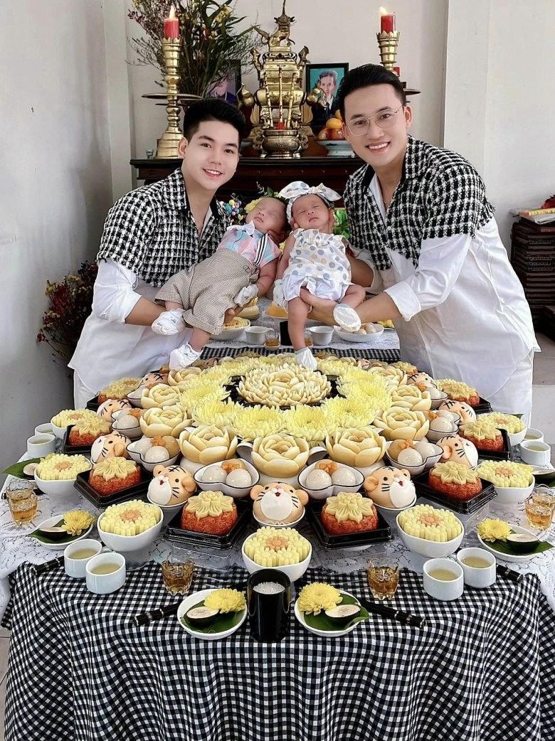 Cả nhà tất bật trong bệnh viện lo cho Muội Muội không chuẩn bị được gì! May có cô Truc Giao lo chu đáo cho 2 cháu mâm cúng thật lung linh!". Mâm cúng thịnh soạn, đẹp mắt cho thấy Hà Trí Quang và Thanh Đoàn rất trân trọng cặp con trai, con gái đáng yêu này.