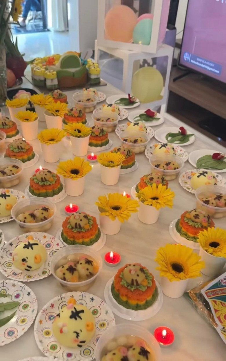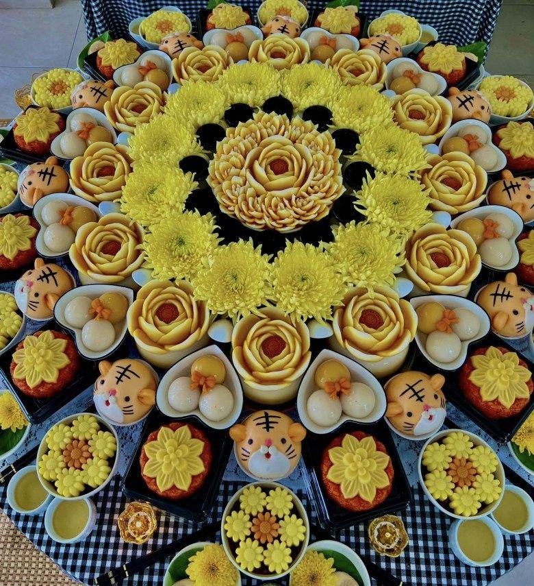 Mới đây nhất phải kể đến mâm tiệc đầy tháng của con thứ 3 nhà hotmom Thanh Trần. Mâm lễ cũng được bà mẹ đặt làm đủ đầy không thiếu thứ gì. Các loại bánh từ bánh bao, bánh thạch cho đến xôi đều có tạo hình chú Hổ dễ thương.