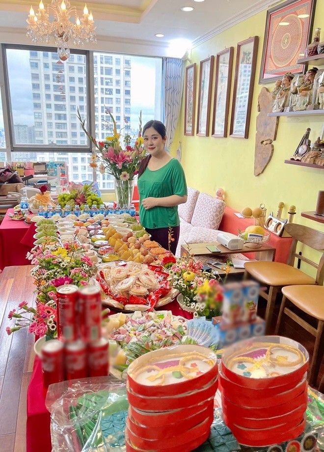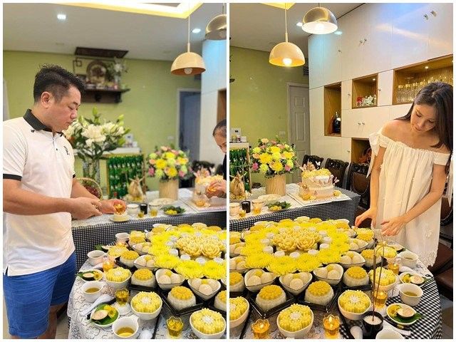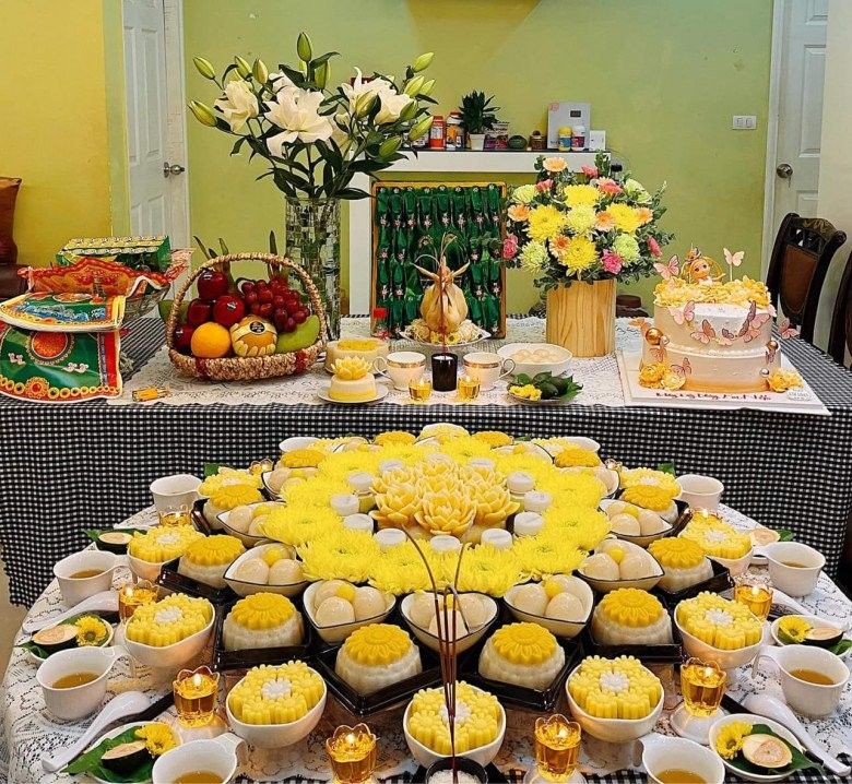 Ca sĩ Kiwi Ngô Mai Trang và ông xã Đỗ Hoàng Dương chuẩn bị mâm lễ thịnh soạn với tông vàng làm màu chủ đạo để cúng đầy tháng cho con thứ 4. Bàn tiệc cúng gồm mâm lễ cúng chay với xôi, chè, bánh trôi, hoa cúc vàng, nến, trầu cau... và mâm lễ cúng phía trên có gà luộc, bánh trôi, xôi, bánh gato, hoa tươi, quả và quần áo.