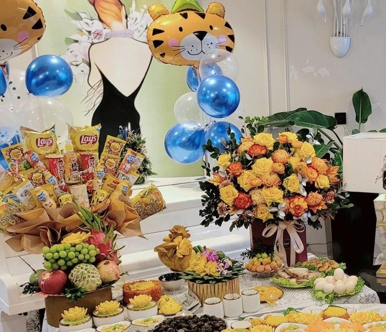 Tiệc đầy tháng con thứ 3 nhà Mạnh Trường được tổ chức ở phòng khách của gia đình, chuẩn bị trang trọng thành hai bàn khác nhau với rất nhiều món lễ vật được phân chia rõ ràng, cẩn thận. Thậm chí bát để đựng xôi chè cũng cầu kì và đẹp mắt từ loại bát màu trắng sang trọng có viền vàng. Bánh cũng được tạo hình chú Hổ dễ thương để đúng chuẩn năm Dần 2022.