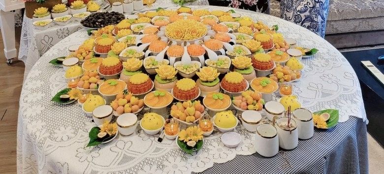 Một bàn tiệc với đầy đủ các món xôi chè, bánh, hoa... vô cùng đẹp mắt