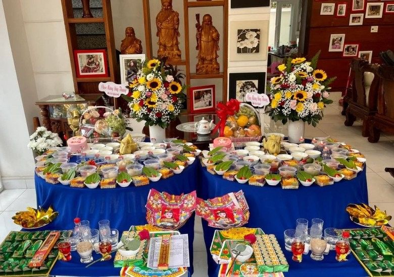 Một bàn riêng được chuẩn bị có hoa, quả, bánh kẹo, bánh thạch, gà luộc, trứng luộc...