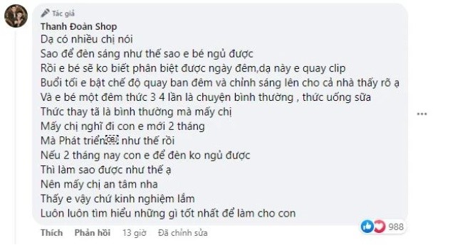 "Dạ có nhiều chị nói sao để đèn sáng như thế sao em bé ngủ được, rồi nói em bé sẽ không biết phân biệt được ngày đêm. Này em quay clip, buổi tối em bật chế độ quay ban đêm và chỉnh sáng lên cho cả nhà thấy rõ ạ. Và em bé một đêm thức 3-4 lần là chuyện bình thường, thức uống sữa và thức thay tã là bình thường mà mấy chị. Mấy chị nghĩ đi con em mới 2 tháng mà phát triển như thế rồi. Nếu 2 tháng nay con em để đèn không ngủ được thì làm sao được như thế? Nên mấy chị an tâm nha. Thấy em vậy chứ kinh nghiệm lắm", bạn trai Hà Trí Quang giãi bày.