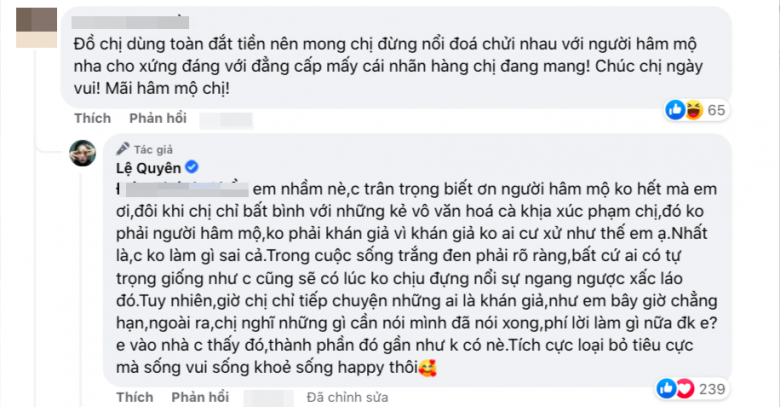 Lệ Quyên đanh thép bày tỏ quan điểm cá nhân về lẽ sống cũng như phong cách thời trang khi có người nhận xét rằng, áo quần cô mặc vốn đắt đỏ nên mong cô đừng nổi đoá tranh chấp với những lời bình chê bai, tiêu cực.