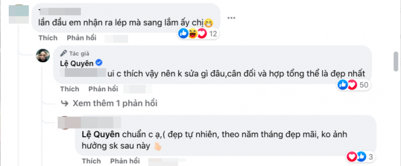 Song mặt khác, vẫn có nhiều chị em đồng tình rằng, Lệ Quyên dù "màn hình phẳng" nhưng lại rất sang. Bà mẹ 1 con gật gù: "Chị thích vậy nên không sửa gì đâu, cân đối và hợp tổng thể là đẹp nhất".
