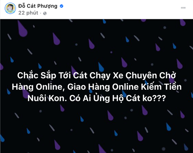 Thời gian qua, Cát Phượng dành nhiều thời gian bán hàng online trên fanpage. Trước đó, cô cũng từng có dòng trạng thái nửa đùa nửa thật trên trang cá nhân: "Chắc sắp tới Cát chạy xe chuyên chở hàng online, giao hàng online kiếm tiền nuôi con. Có ai ủng hộ Cát không?".