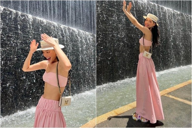 Đi du lịch, Khánh Linh chọn diện croptop ngắn cũn cùng chân váy dài bồng bềnh. Outfit nửa kín nửa hở mang sắc hồng giúp cô nàng trông ngọt ngào lẫn quyến rũ mê hoặc lòng người.