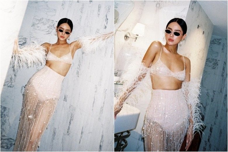 Mặc chiếc áo croptop vừa mỏng manh chỉ nối bằng sợi chỉ vừa chỉ che được vòng 1, thế nhưng Khánh Linh chẳng hề mang đến cảm giác phô phang, phản cảm. Đó là bởi cách diện đồ rất khéo léo của mình.