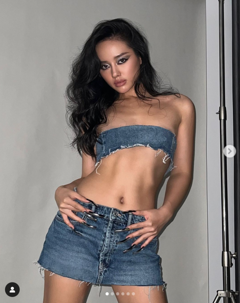 Khánh Linh khoe ảnh "lên đồ" với chiếc áo croptop siêu ngắn, chỉ che được mỗi vòng 1 và phối cùng chân váy jeans điệu đà.