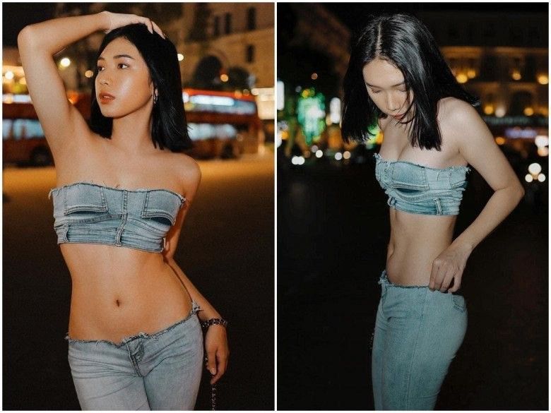 Thời gian trước, một cô gái Việt cũng tự tin đăng tải hình ảnh khoe style "không ai dám diện" này. Học hỏi Julia Fox, người đẹp này cũng chỉ sử dụng duy nhất 1 chiếc quần jean cạp cao cắt ra thành 2 phần, tạo ra outfit bao gồm áo croptop và quần cạp thấp.