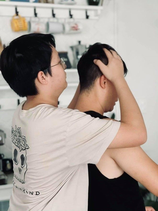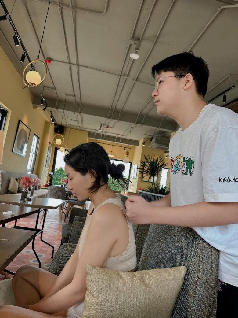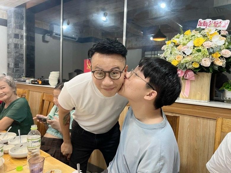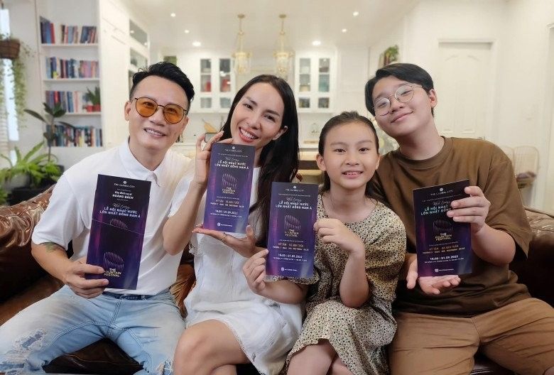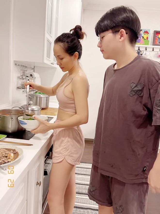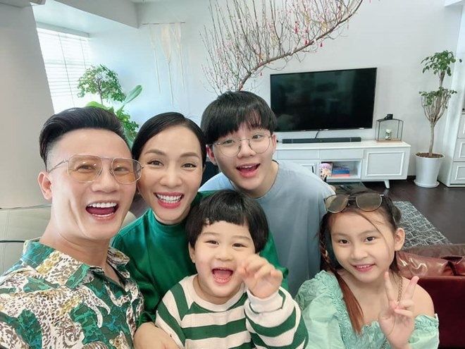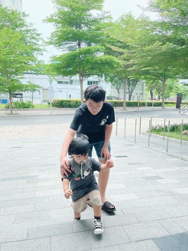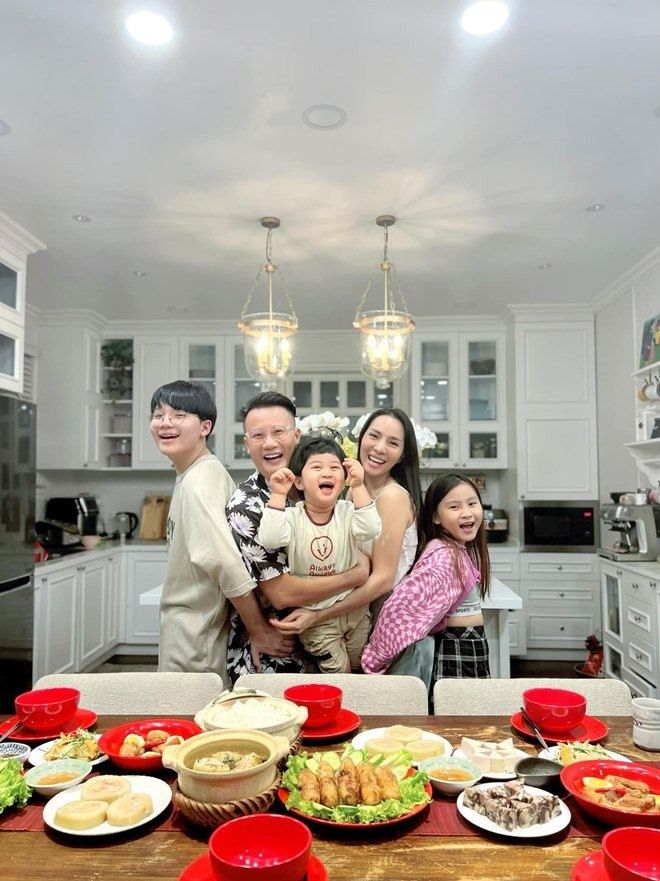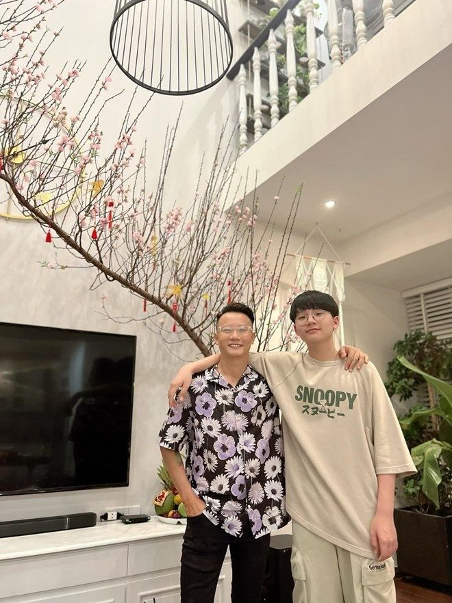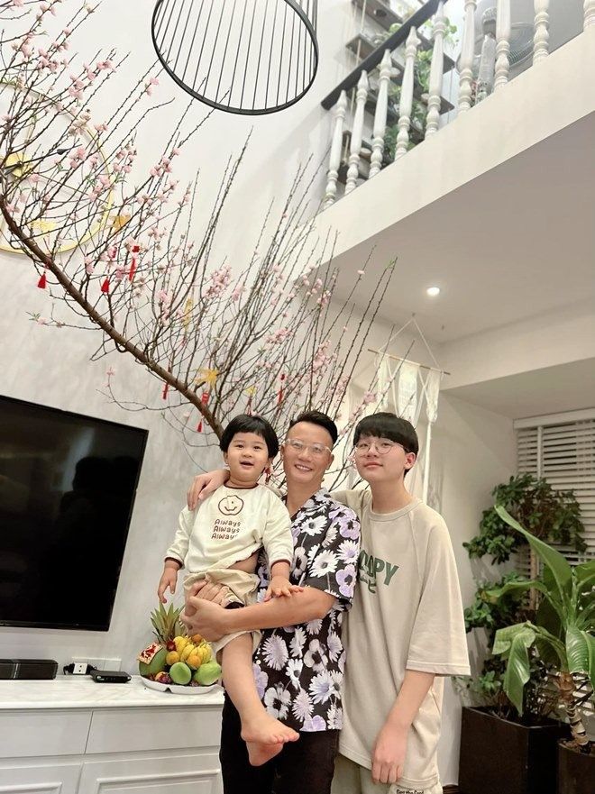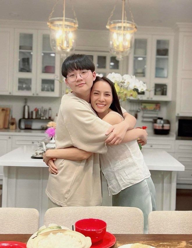 Vợ nam nhạc sĩ từng khoe hình bên cậu cả của mình và bày tỏ: "Gần 15 năm trước mình ôm trọn nó trong lòng, 15 năm sau nó ôm trọn mình vào lòng rồi nhấc bổng mình lên. Rồi suốt ngày chọc cho mẹ cáu, mắng nó thì nó phì cười! Yêu thằng tó bự này".