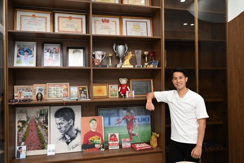 Phòng bếp và phòng khách được ngăn cách bởi một kệ gỗ, nơi đây ông bố bỉm sữa trưng bày những bằng khen, huy chương mà anh đạt được cùng những bức ảnh anh thi đấu trên sân cỏ. Tại phòng bếp cũng đặt một bàn ăn lớn màu trắng với mặt bàn bằng đá.