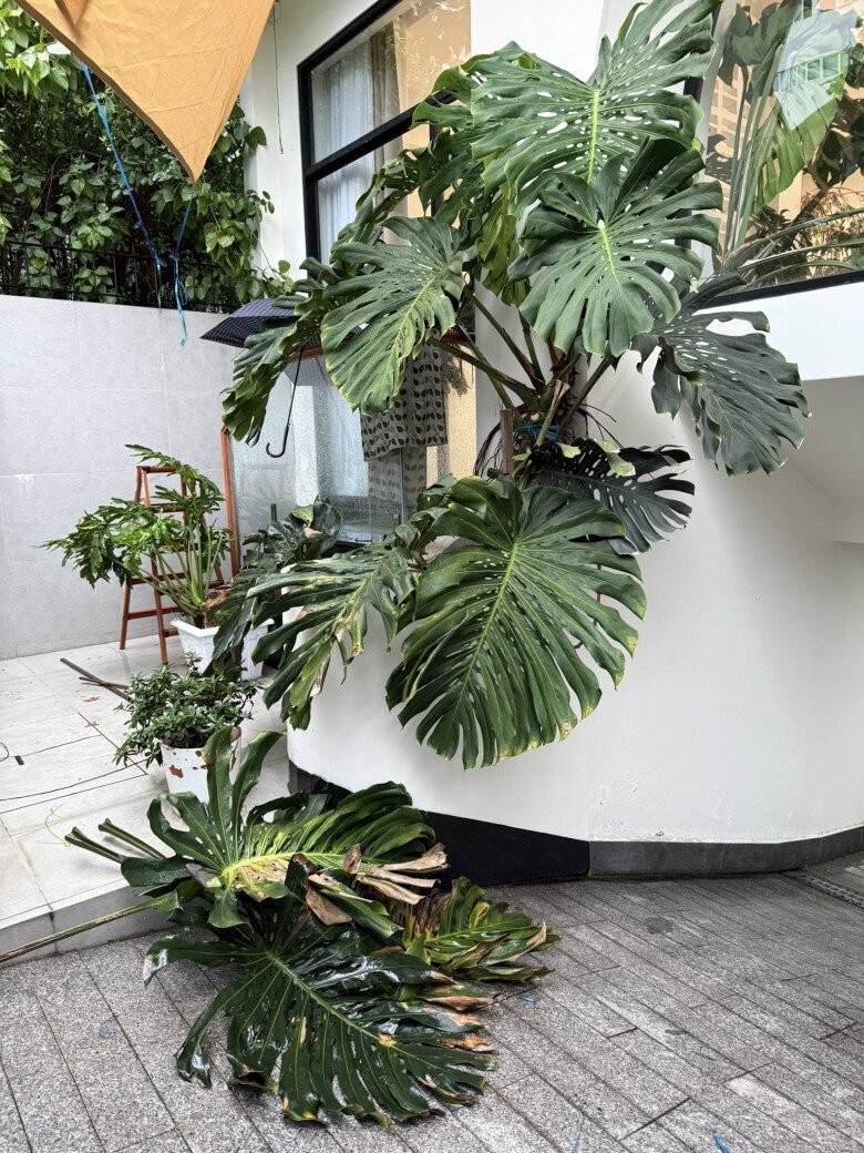 Một phần lá đã úa vàng và cháy nắng, được cắt tỉa để tránh lây bệnh cho cây. Tuy nhiên, đây là chuyện “thường ngày ở huyện” với người chơi Monstera lâu năm như Vân Trang.