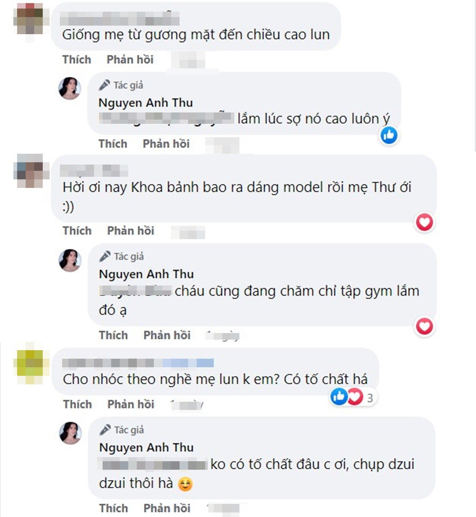 Song cũng có nhiều ý kiến ủng hộ cô cho theo theo nghề mẫu chuyên nghiệp. Nói về chiều cao của con trai, Anh Thư có lúc hoảng sợ vì con cao quá nhanh và nhiều. Người đẹp cũng hé lộ luôn bí kíp con phát triển đến vậy.