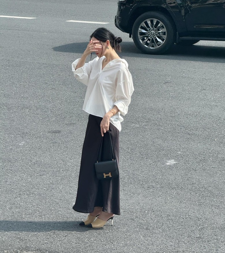 Áo sơ mi là lựa chọn an toàn khi phối cùng chân váy satin. Sự kết hợp giữa chất liệu đứng form của sơ mi và độ rủ của váy giúp tạo nên tổng thể hài hòa.
