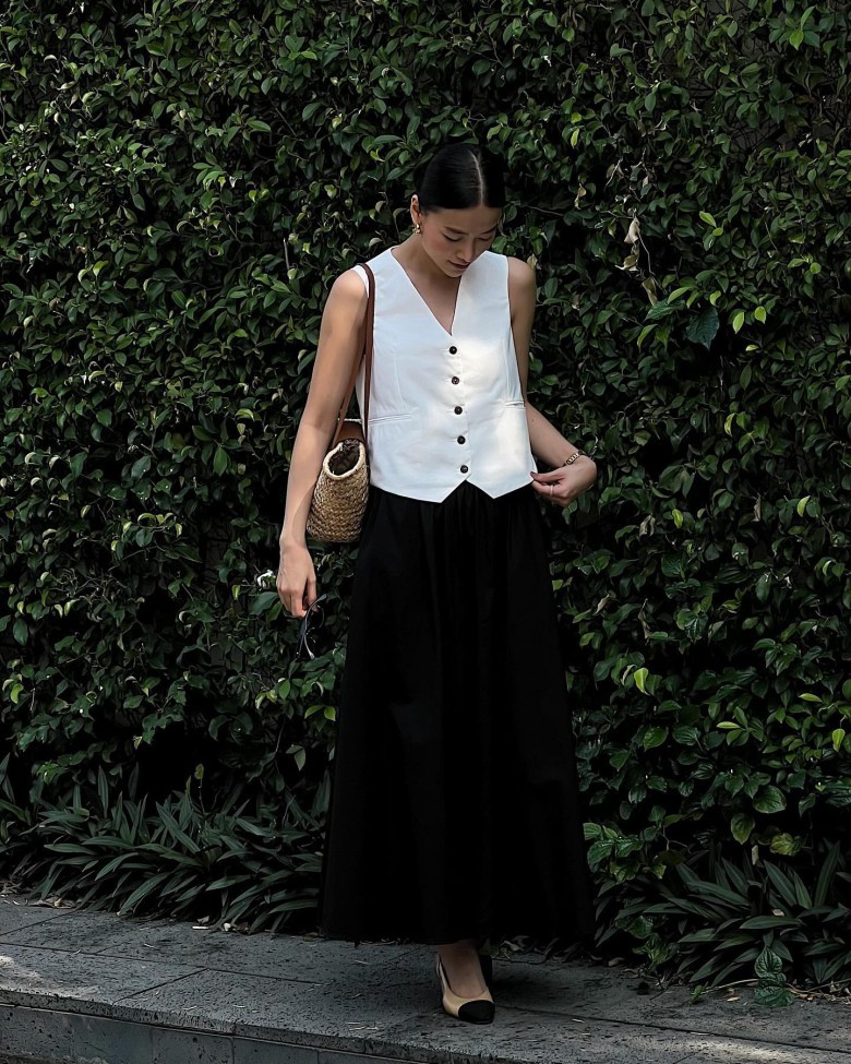 Áo vest cộc tay kết hợp cùng chân váy satin mang lại vẻ ngoài thanh lịch nhưng vẫn trẻ trung. Phần vest giúp tạo cấu trúc cho tổng thể, trong khi chân váy satin giữ lại sự mềm mại.
