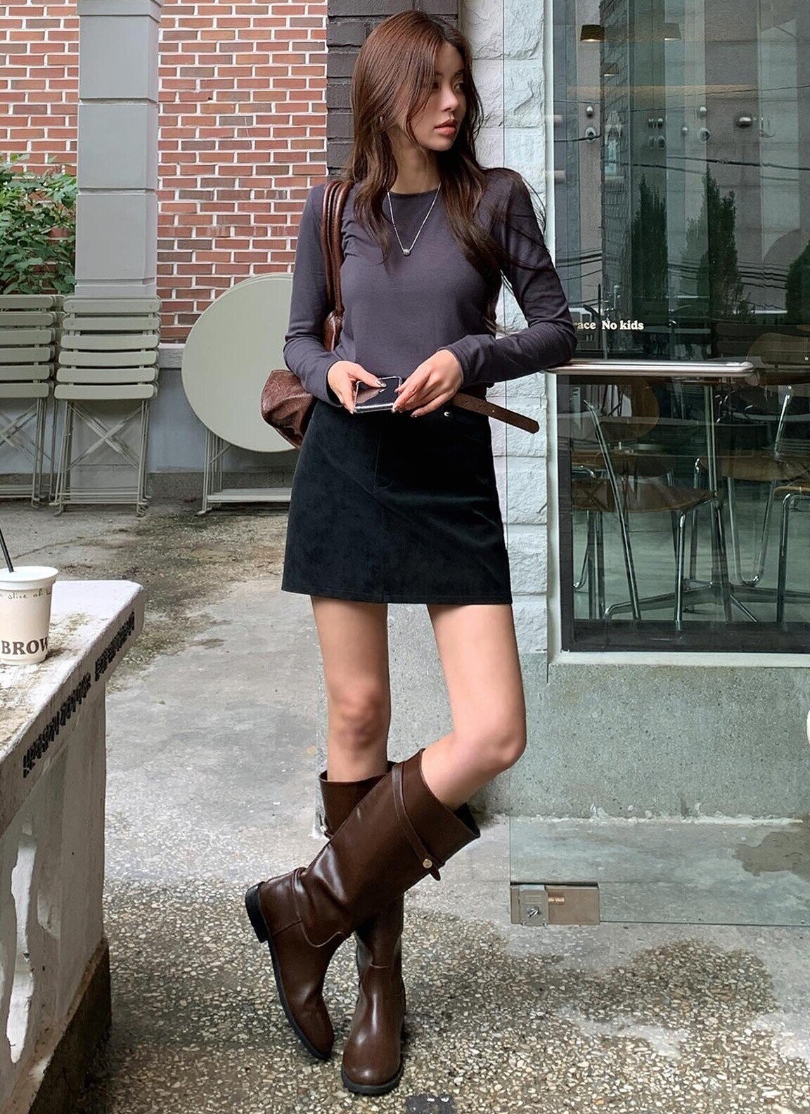 Phối chân váy ngắn với áo dài tay giúp cân bằng giữa kín đáo và trẻ trung. Công thức này dễ áp dụng quanh năm, tạo tổng thể gọn gàng và lịch sự.