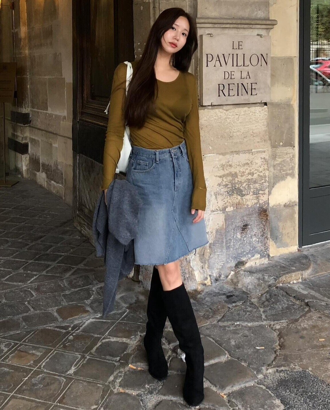 Các kiểu áo dài tay trơn màu, phom gọn gàng sẽ giúp vóc dáng trông cao ráo hơn khi kết hợp cùng chân váy ngắn cạp cao. Nếu muốn tăng hiệu ứng tôn dáng, chị em có thể sơ vin áo gọn gàng hoặc chọn áo ôm nhẹ phần eo. Với môi trường công sở trẻ trung hoặc khi đi học, công thức này mang lại vẻ ngoài gọn gàng, hiện đại mà không quá cầu kỳ. Chỉ cần thêm giày búp bê, sneaker hoặc boots cổ ngắn, outfit đã đủ hoàn chỉnh để diện quanh năm.