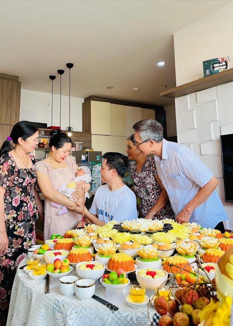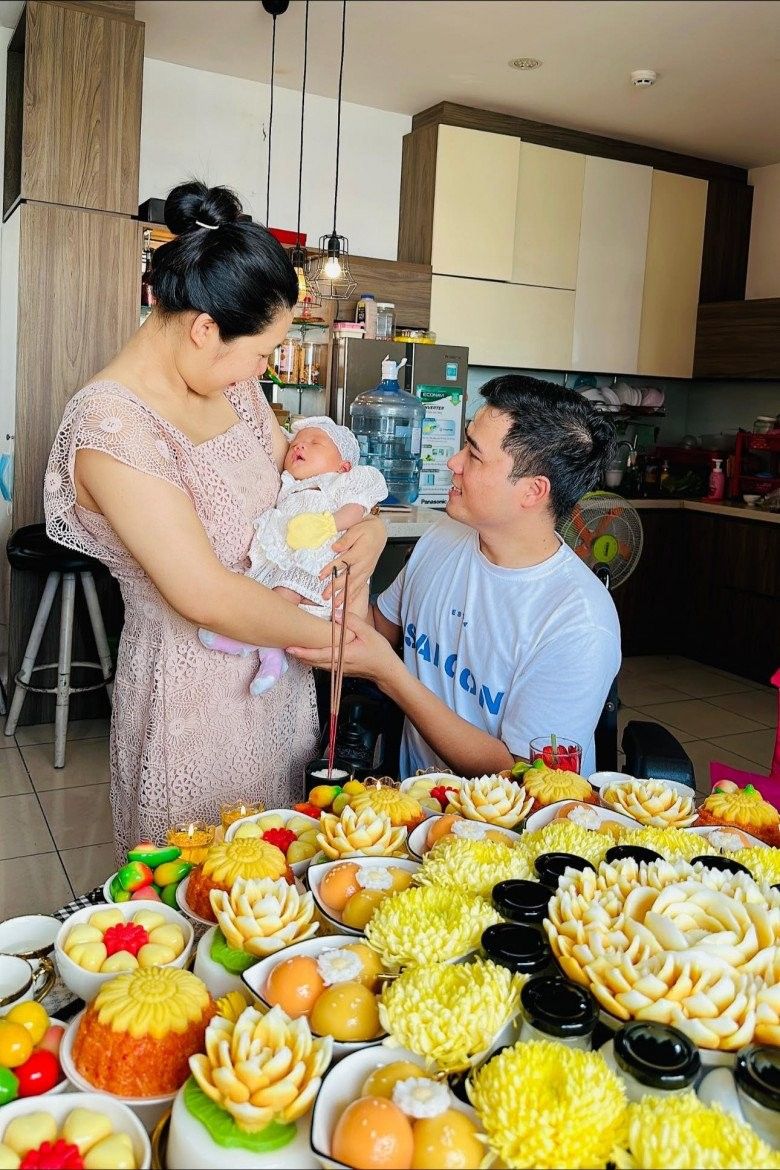 Lê Phương chuẩn bị mâm cúng đầy tháng giản dị, chỉn chu cho ái nữ.