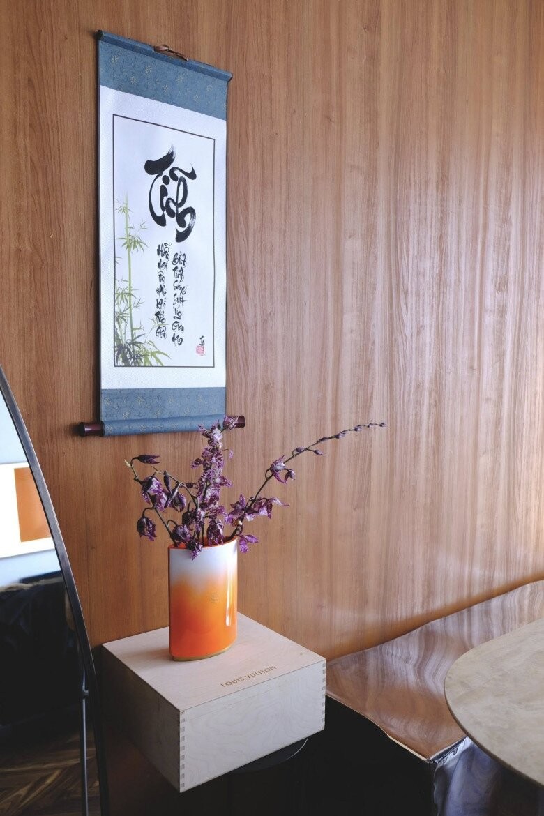 Trên đường là câu đối anh mới được viết tặng, nổi bật trên tường gỗ làm không gian hiện đại bỗng trở nên đậm nét truyền thống.