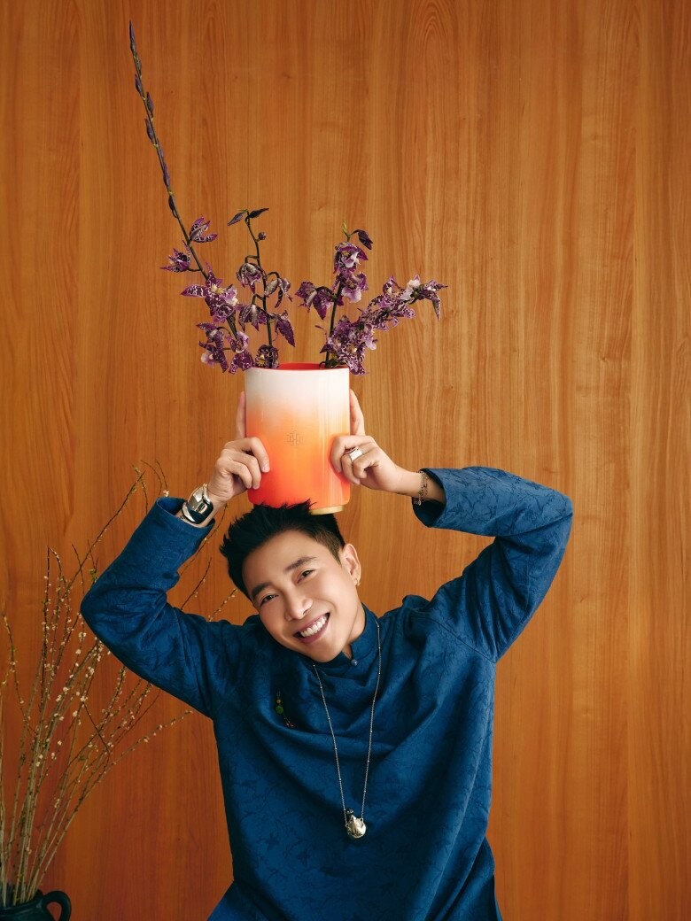 Lọ hoa màu cam nổi bật và độc đáo. Nam stylist tự thốt lên: "Nhiều màu quá ko thiếu một màu nào đúng là Tết mà".