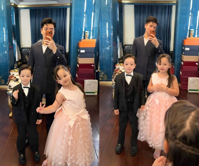 Mới đây, doanh nhân Đỗ Quang Vinh (con cả Bầu Hiển, anh chồng Đỗ Mỹ Linh) đăng tải khoảnh khắc cùng 2 con là Thỏ và Gấu "lên đồ" lộng lẫy để đi dự tiệc sinh nhật của ông nội. Bé Gấu diện vest đen bảnh bao, riêng Thỏ diện váy hồng xinh xắn. 2 nhóc tì được ví như "hoàng tử", "công chúa".