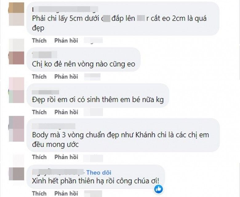 Bên cạnh những lời khen ngợi xinh hết phần thiên hạ, Lâm Khánh Chi lại bị hỏi câu khó như: "Đẹp rồi em ơi, có sinh thêm em bé nữa không", có chị em ghen tị lại nói: "Chị không đẻ nên vòng nào cũng eo", có người lại khắt khe cho rằng, cô cần tăng size vòng 1 thêm 5cm và cắt eo 2cm nữa mới đẹp.