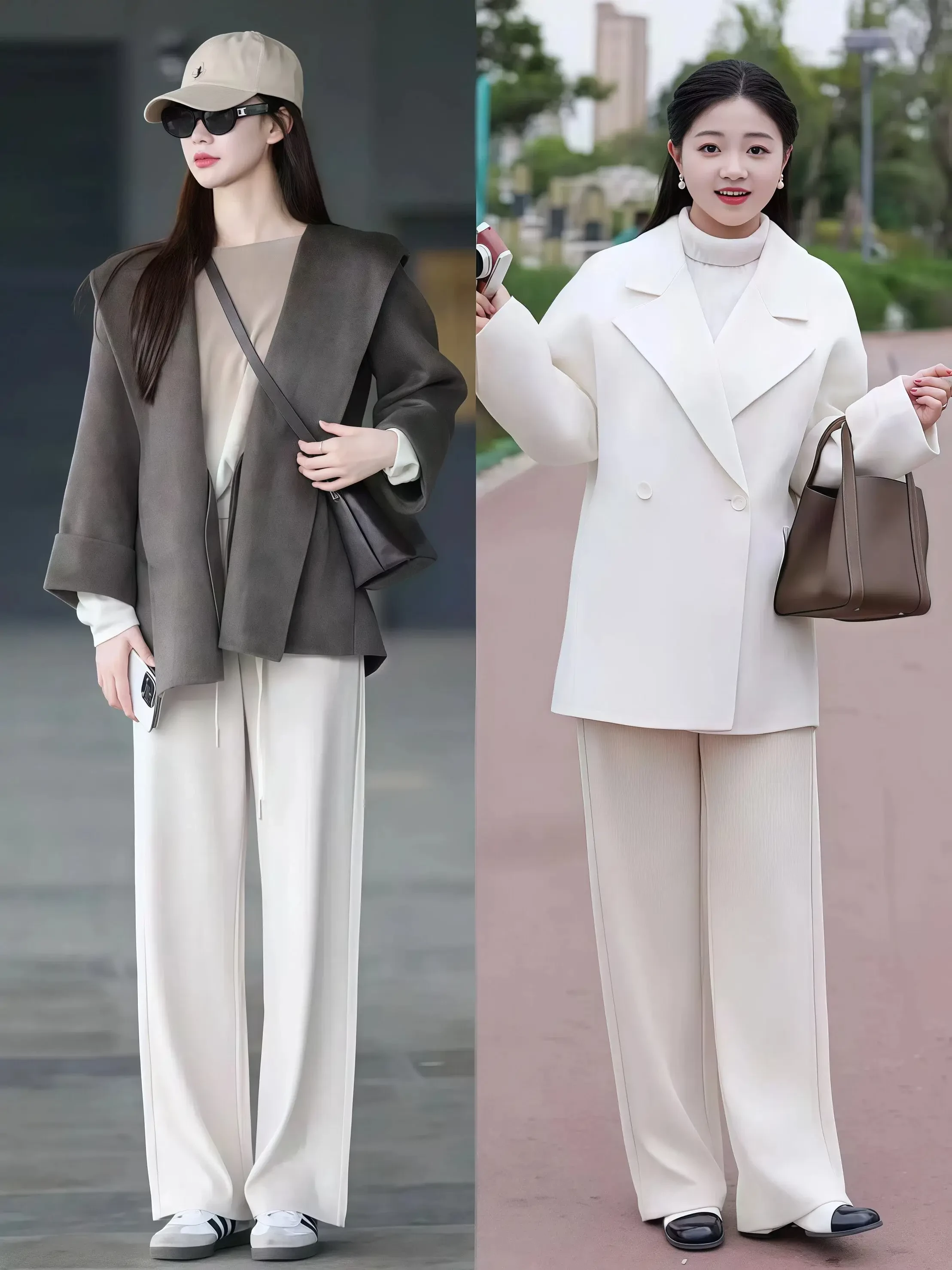 Cách phối này còn đặc biệt tôn da. Màu be đặt gần khuôn mặt giúp gương mặt trông mềm mại, trong khi quần trắng ở phần thân dưới tạo sự chuyển tiếp màu sắc tự nhiên, không làm da vàng bị xỉn. Để set đồ hài hòa hơn, bạn có thể chọn áo len bên trong cùng tông be hoặc kem.