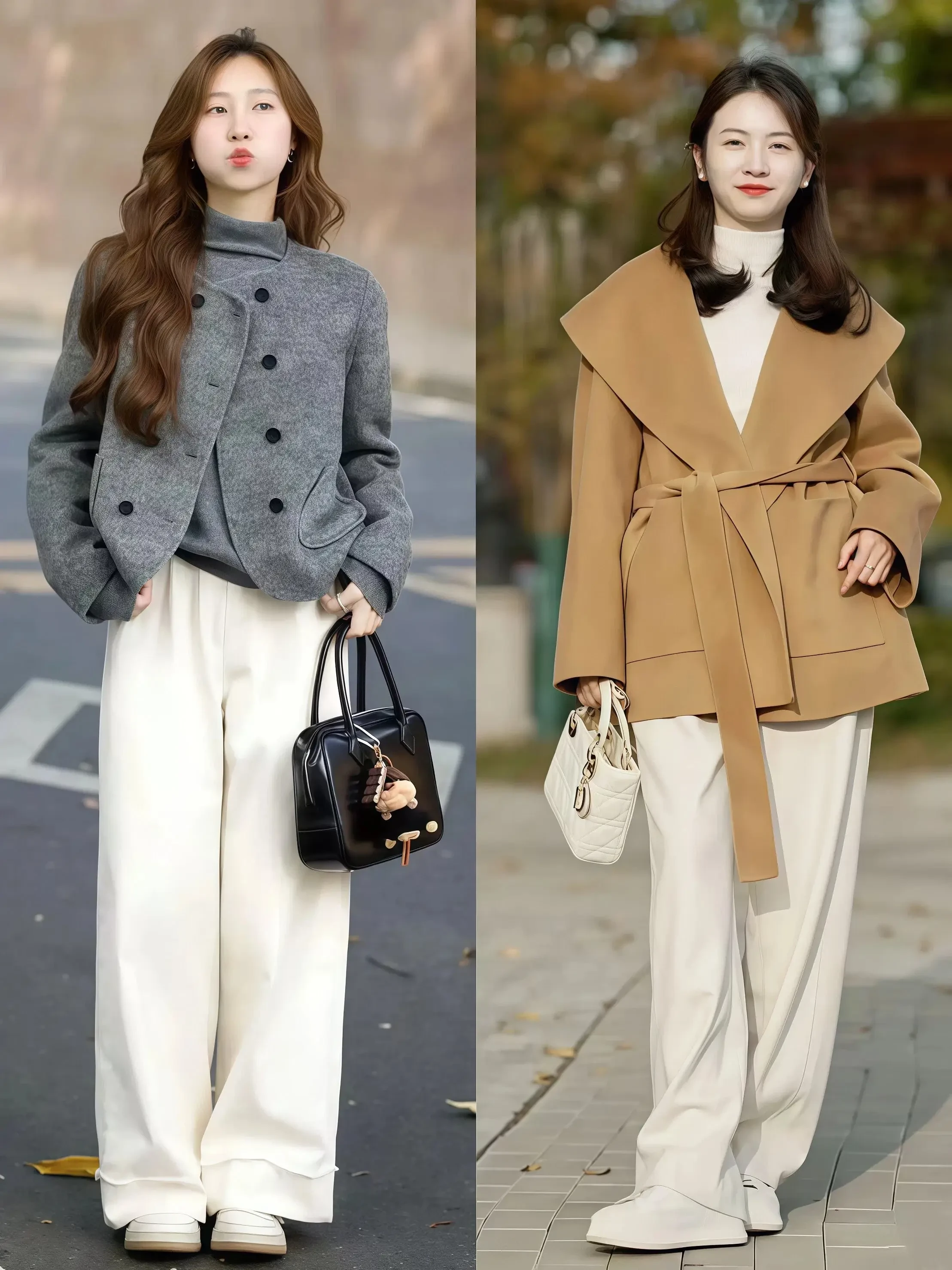 Áo khoác màu be là item quen thuộc của mùa đông, nhưng nếu chỉ kết hợp theo lối an toàn, tổng thể rất dễ trở nên nhàm chán. Quần trắng chính là “điểm sáng” giúp màu be trông tươi mới và sạch sẽ hơn, đồng thời trung hòa cảm giác đơn điệu.