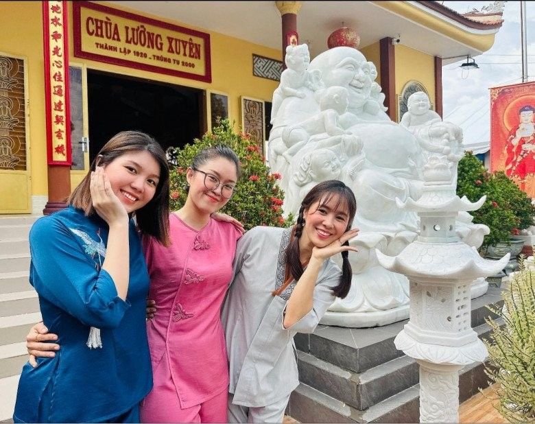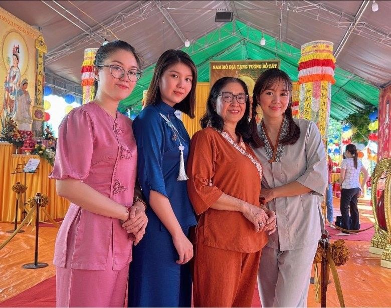 Bà chị em đọ sắc cùng mẹ khi đi lễ phật.