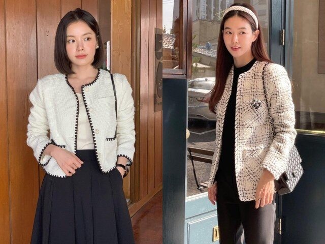 Áo khoác tweed dáng lửng mang lại vẻ ngoài sang chảnh mà vẫn hack dáng hiệu quả. Chỉ cần chọn phom gọn, màu sáng hoặc trung tính, tweed sẽ giúp chị em trông trẻ trung hơn. Khi phối cùng váy ngắn hoặc quần cạp cao, tổng thể trở nên cao ráo, tinh tế.