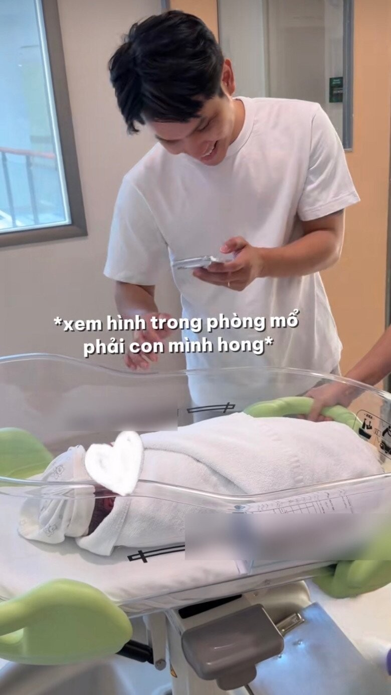 Chi tiết khiến nhiều người thích thú đó là trước khi nhận con trai về phòng, chồng Chế Nguyễn Quỳnh Châu còn cẩn thận mở điện thoại, xem bức ảnh đã chụp con trai trước đó và so với em bé hiện tại để xem có giống hay không.