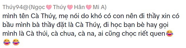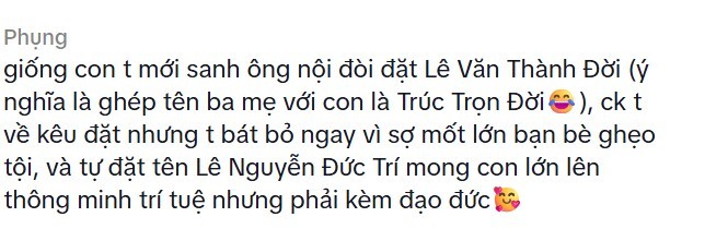 Bên cạnh những cái tên đẹp mà mọi người gợi ý cho ông bố, ai nấy đều chú ý dòng chia sẻ của một cô gái ở phần bình luận. Người này bày tỏ sự "ghen tỵ" khi thấy em bé sắp chào đời có những người bố, người mẹ rất tuyệt vời, kĩ tính và rất cẩn thận trong việc lựa chọn cái tên hay để đặt cho con bởi bản thân của cô bé tự nhận suýt là "nạn nhân" của một cái tên không hay cũng chỉ việc những giận hờn, oán trách của người lớn.