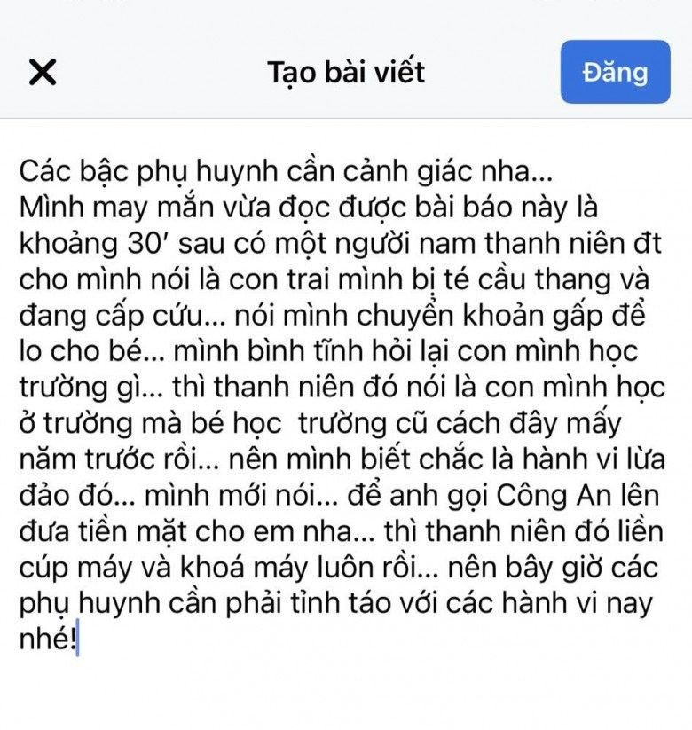 Cụ thể, ông xã Lâm Vỹ Dạ cho hay anh nhận được một cuộc điện thoại từ một thanh niên lạ mặt nói rằng con trai của anh bị ngã cầu thang và đang cấp cứu. Người này cũng muốn anh chuyển tiền gấp để họ giúp lo cho bé. Được biết, phương thức này đã khiến rất nhiều bậc cha mẹ khác bị sập bẫy và nhanh chóng chuyển hàng chục, thậm chí hàng trăm triệu chỉ với mong muốn con nhanh chóng được bình an.
