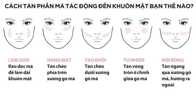 Nếu muốn gương mặt gọn gàng, bạn cần kéo dọc phần má để làm dài khuôn mặt. Nếu make up gương mặt đứng tuổi với phần má hơi xệ, bạn cần tán chéo phấn má đi lên theo xương gò má để nâng cơ mặt. Ngược lại, với gương mặt dự nhiên lại chỉ cần đánh chính giữa má.